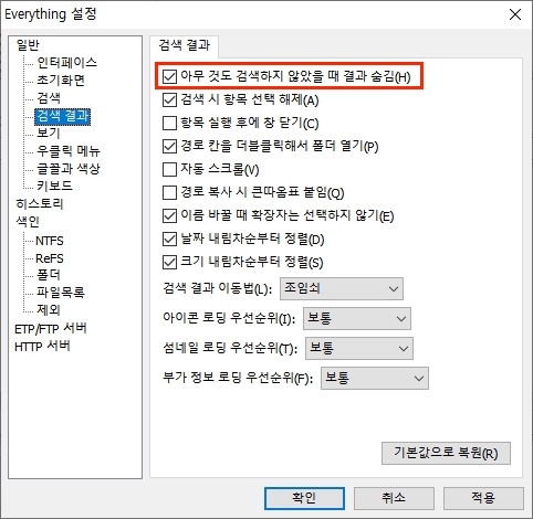 또 Everything을 실행했을 때, 아무것도 검색하지 않은 상황에서는 아무런 결과가 보이지 않도록 설정할 수도 있습니다.