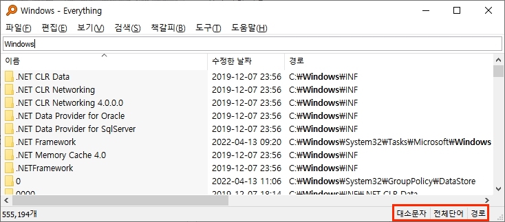 예를 들어 세 가지 옵션을 모두 켜고 'Windows'를 검색하면, 아래처럼 검색어와 '대소문자가 모두 일치'하면서 '단어가 일치'한 '경로'를 검색해 보여주는 것을 알 수 있습니다.