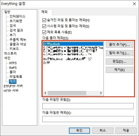 만일 특정 폴더는 검색에서 제외하고 싶다면, '설정-색인-제외' 메뉴에서 검색 대상에서 제외하고싶은 폴더를 등록하면 됩니다.