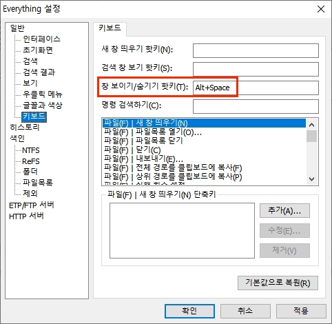 저의 경우 'Alt+Space'로 설정을 해 두었는데, 이렇게 해 두면 PC를 사용하면서 언제 어디서나 'Alt+Space'를 눌러 Everything을 호출해낼 수 있습니다.