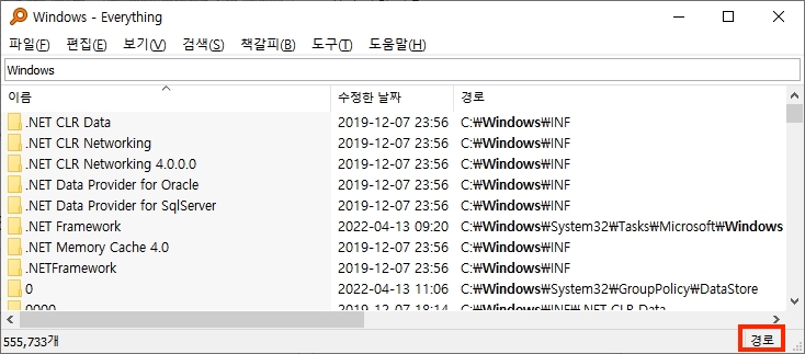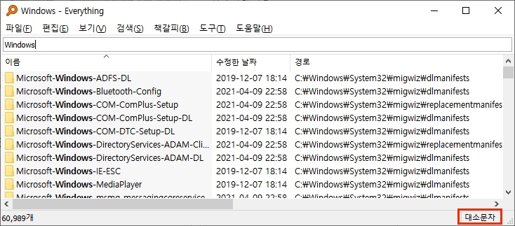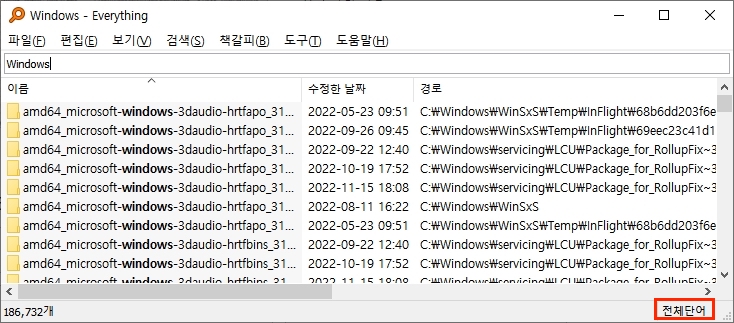 예시로 'Windows'를 입력해 보았습니다. 'Windows'가 포함된 파일 및 폴더를 빛과 같은 속도로 찾아줍니다.